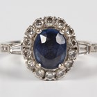 A white gold, sapphire and diamond oval cluster ring, claw set with the oval cut sapphire within a surround of circular cut diamonds between tapered baguette and circular cut diamond shoulders, detailed’ 750’, weight 4.7g, ring size approx P1/2.
