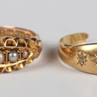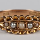 A late Victorian 15ct gold ring, mounted with a row of five graduated half-pearls, Birmingham 1899, weight 2.9g, ring size approx P, and an 18ct gold ring, star gypsy set with a row of five diamonds (part of shank and hallmark lacking), weight 2.2g.