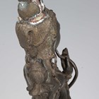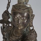 A Tibetan brown patinated bronze figure of Tara, 18th century, modelled standing wearing ornate headdress, bead jewellery and a celestial scarf, holding lotus stems in each of her hands, on a beaded and lotus moulded pedestal, height 26.5cm. Provenance: the Alain Presencer Collection. Note: Tara is an important female Buddha, especially revered in Vajrayana and Mahayana Buddhism.