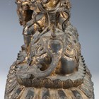 A Tibetan gilt lacquered bronze figure of Simhanada Avalokiteshvara, seated on the back of a Buddhistic lion, Ming Dynasty, 16th century, the bodhisattva finely modelled in the posture of royal ease, wearing elaborate headdress, celestial scarf and beaded jewellery, his right elbow resting on his knee, the right hand touching the upturned head of the lion, on which he is seated, all raised on a double lotus moulded pedestal, height 51cm. Provenance: the Alain Presencer Collection, Frank Ormond, 2013, and Bonhams, Hong Kong, 2nd October 2018. Note: this figure group is a classic Ming dynasty representation of 'The Lion Voiced Lord' Simhanada Avalokiteshvara.