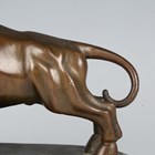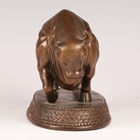 A Sino-Tibetan brown patinated bronze figure of a bull, 20th century, modelled in an aggressive pose, standing four-square with head lowered, on an oval base with cast foliate panels against a 'Y' diaper ground, height 12.4cm. Provenance: the Alain Presencer Collection.