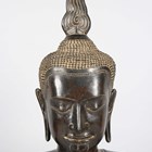 A large Thai brown patinated bronze figure of Buddha, 17th/18th century, modelled seated in dhyanasana on a curved triangular pedestal, with hands held in bhumisparsa mudra, the face with serene expression and elongated earlobes, his hair rising to a domed usnisa and flame surmount, height 120cm. Provenance: the Alain Presencer Collection.