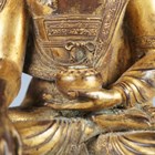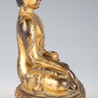 A Tibetan gilt bronze figure of a medicine Buddha, 18th century, modelled seated in dhyanasana holding a medicine pot in his left hand, wearing an ornately trimmed robe, his hair tightly curled and rising to a domed usnisa, on a double lotus throne, height 15.4cm. Provenance: the Alain Presencer Collection. Note: a medicine Buddha was an important bodhisattva in Tibetan Buddhism, who represents the healing aspects of all Buddhas.