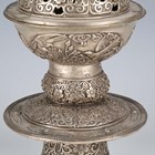 A Himalayan cast silvered metal incense burner and cover, 20th century, the domed cover cast and pierced with bud finial above lappet bands and lotus panels, the bowl decorated with birds and flowers above further lotus decoration to the stem, discoidal knop and spreading base, heigh 27.5cm. Provenance: the Alain Presencer Collection.