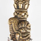A Tibetan gilt bronze and iron phurba, probably 16th century, the pommel cast with the three heads of Vajrakila beneath a vajra crown finial, the lotus and eternal knot banded handle extending to the mouth of Makara, issuing the iron three-sided tapering blade, length 18.7, together with a Tibetan gilt bronze phurba with zoomorphic wolf-head pommel, lotus and eternal knot banded handle, the mouth of Makara issuing the three-sided tapering blade, length 13.7cm. Provenance: the Alain Presencer Collection.