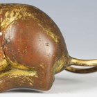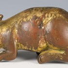 A rare pair of Tibetan gilt bronze figures of Nakula, 16th/17th century, each mongoose modelled in a crouching pose, grasping a jewel between its teeth, the face with cold painted detail, length 15.5cm. Provenance: Robert Bouatta, London, 2005, and Bonhams Hong Kong, 2nd October 2018, Lot 103. Provenance: the Alain Presencer Collection. Note: mongooses are not native to Tibet, but their use illustrates the approach Tibetans took to preserving core Indian Buddhist teachings and iconography. The wealth deities, Jambhala and Kubera, are often depicted accompanied by a mongoose (nakula), which they would squeeze to spit out gems.