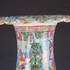 A Chinese Canton famille rose porcelain vase, mid-19th century, the shouldered tapering body painted and gilt with opposing rectangular panels of figural court scenes, reserved against a ground of precious objects, butterflies and flowers, beneath a similarly decorated flared neck applied with Buddhistic lion handles and chilongs to shoulder, height 63.5cm (minor faults).