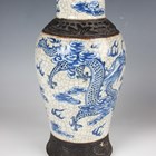 A pair of Chinese blue and white crackle glazed porcelain vases, late 19th century, each baluster body painted with dragons amidst vapours within moulded iron oxide washed borders, height 24.6cm (each drilled near to base).