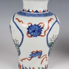 A pair of Chinese wucai porcelain vases, Transitional style but late 19th/early 20th century, each of baluster form, painted with opposing panels of a mythical horse above waves, height 19cm, together with a pair of Chinese Canton famille rose porcelain vases, mid-19th century, of square tapering form, typically painted with figures, flowers and butterflies, height 14cm (faults), and a famille verte powder blue ground porcelain baluster vase and cover, height 22.2cm (faults).