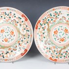 A Japanese Imari porcelain circular dish, Meiji period, painted with quatrelobed panels filled with flowers and figure walking beside bamboo, on a flower filled trellis ground, diameter 37.4cm, together with a pair of Imari circular dishes, painted and gilt with pine trees, diameter 30.7cm, two other Imari dishes and two small bottle vases.