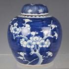 A collection of eleven Chinese blue and white porcelain ginger jars, mostly early 20th century, each painted with blossoming prunus, heights ranging from 10cm to 16.5cm, together with three covers.