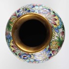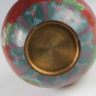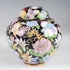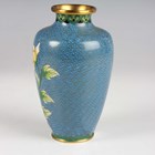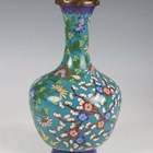 A Chinese cloisonné bottle vase, mid-20th century, decorated with polychrome flowers on a turquoise ground, height 20.5cm, together with a group of four other Chinese cloisonné vases, heights ranging from 7cm to 29cm, and a Chinese enamel jar and cover, painted with butterflies, fruit and flowers on a black ground, height 14.4cm.