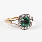 A gold and silver set, foil-backed emerald and diamond cluster ring, early 19th century, the foil-backed emerald mounted within a surround of rose cut diamonds, between split shoulders, unmarked, weight 2.6g, ring size approx O1/2.
