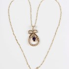 A 9ct gold, amethyst and seed pearl pendant of drop shaped form with a tied bow surmount, collet set with the oval cut amethyst to the swing centre, otherwise set with seed pearls, length 3.5cm (two seed pearls lacking), with a gold neckchain on a gilt metal clasp, length 46cm, total weight 5g.
