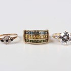 A 9ct gold, blue, yellow and green gem set ring, ring size approx M1/2, a 9ct gold and colourless gem set ring, ring size approx R, and a 9ct gold, sapphire and colourless gem set ring, ring size approx M (one colourless gem lacking), total weight 9.7g.