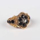A late George IV gold, diamond and black paste set cluster mourning ring, mounted with the cushion shaped diamond within a surround of black pastes, between black paste set shoulders, detailed ‘Captn Edwd Harriman Obt 30 March 1829 Aet 72’, weight 4.3g, ring size approx J, with a case.