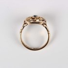 A gold and diamond single stone ring, mounted with a cushion shaped diamond within a scroll decorated shaped circular surround, detailed ‘9ct M&Co’, weight 2.6g, ring size approx G1/2.