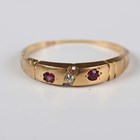 A gold, ruby and diamond three stone ring, mounted with a small cushion shaped diamond between two rubies, weight 1.8g, ring size approx N.