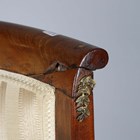 A 19th century French Empire mahogany and gilt metal mounted tub back chair with upholstered seat and back, the downswept arms with dolphin head terminals, raised on square tapering legs with paw feet, height 86cm, width 60cm (some minor repairs).