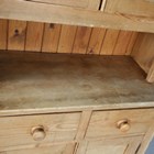 A 20th century Victorian style pine kitchen dresser, the two glazed doors above drawers and cupboards, height 214cm, width 100cm, depth 45cm.