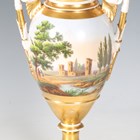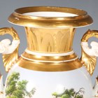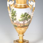 A Continental Paris porcelain Empire style two-handled vase, early 19th century, painted with a continuous figural landscape view flanked by gilt and bisque handles with scrolling goat head terminals, the gilt neck, foot and square base with tooled detail, unmarked, height 33cm.