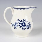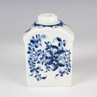 A Lowestoft porcelain tea caddy, circa 1790, painted in underglaze blue with a version of the Mansfield pattern, pseudo underglaze blue Worcester crescent mark to base, height 10cm, together with a floral painted sparrow beak jug, probably Liverpool, height 8.5cm (minor faults).