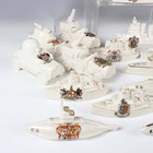 A group of fourteen crested china WWI naval battleships, of dreadnought type, mostly by Arcadian, with a variety of crests including Barnstaple, Bristol and Southall, together with a group of similar WWI military and navel related crested china, including five submarines, anti-aircraft motors and armoured cars.