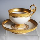 A Copenhagen Empire cabinet cup and saucer, circa 1820-50, the rim exterior and foot with a tooled gilt band, the high scroll handle with lower shell terminal, the matching saucer with raised rim edge, underglaze blue wave mark to bases, diameter of saucer 15cm, a Berlin cabinet cup, 19th century, painted with a continuous harbour scene, underglaze blue sceptre mark to base, height 6cm, a matched Berlin saucer with central face decoration and a mixed group of Continental porcelain, mostly 19th century, including a Paris green ground cabinet cup and saucer with high scroll handle, a similar jug painted with a village scene, height 13.5cm, and ten Copenhagen gilt decorated cups and saucers (faults).