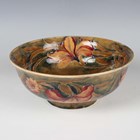 A Moorcroft Pottery Spanish pattern circular bowl, circa 1914, with mottled green or ochre ground, impressed numerals to base with green painted signature, diameter 19.5cm.