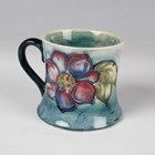 A Moorcroft Pottery Pansy pattern vase, circa 1916, with pale to dark shaded ground, impressed marks to base with green painted signature, height 17.5cm, together with a small Moorcroft Clematis pattern mug, height 5.5cm.