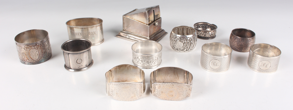 A pair of Victorian silver shaped rectangular napkin rings with engraved decoration, Sheffield 1879 by Martin Hall & Co, six other silver napkin rings and a cigar cutter, total weight 292.3g, together with a German .800 silver oval napkin ring, name engraved, another .800 silver napkin ring and a French silver napkin ring, total weight 126.3g.