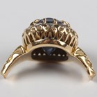 A gold, sapphire and diamond top section of a ring, claw set with a cushion shaped sapphire within a surround of rose cut diamonds, weight 4.5g.