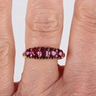 A gold and red gemstone five stone ring, mounted with a row of variously cut graduated red gemstones, unmarked, weight 2.7g, ring size approx N1/2.