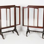 A pair of Victorian mahogany framed fire screens with sliding glass panels and bracket feet, height 106cm, width 63cm.