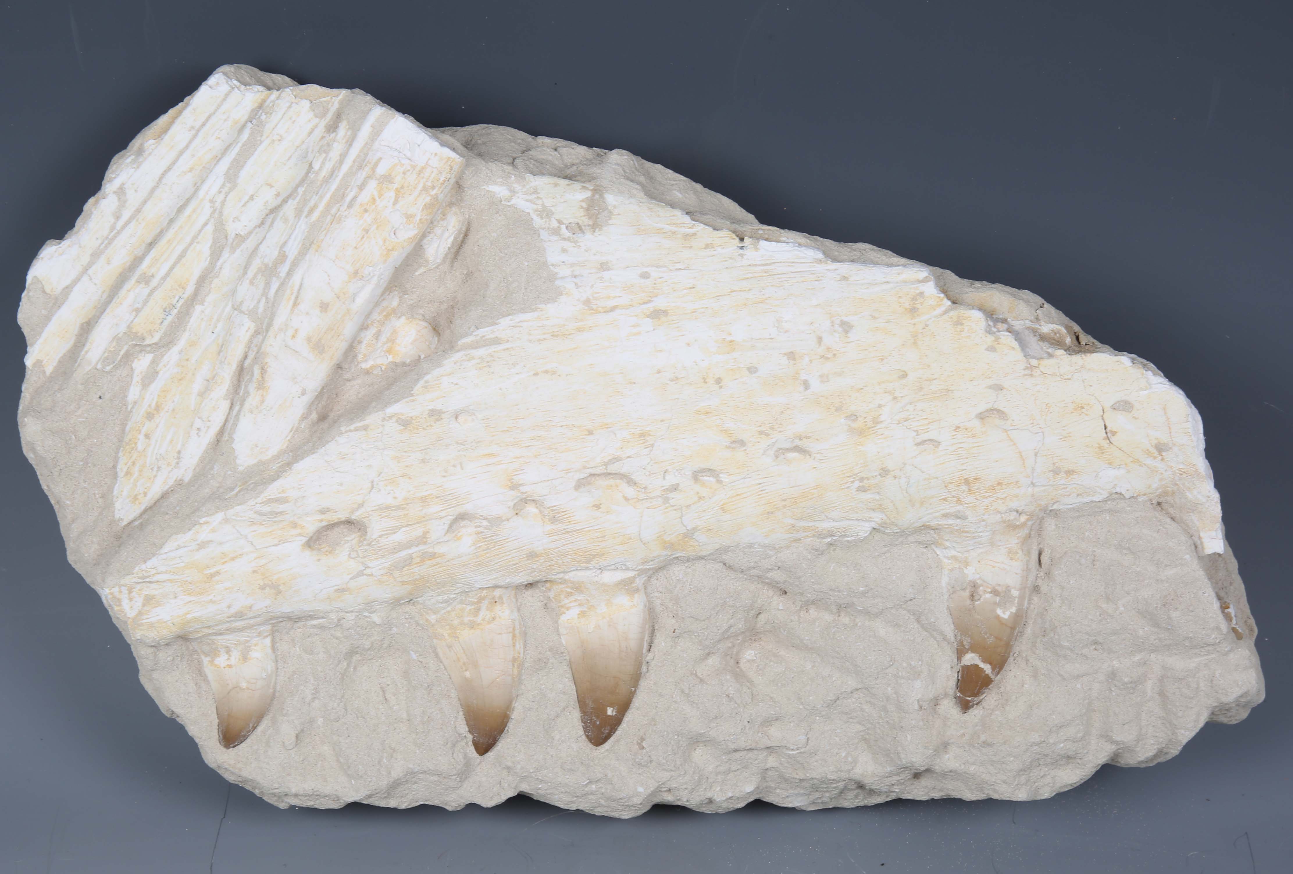 A fossil specimen of a jaw bone with teeth, possibly from a large marine reptile, length 31cm.