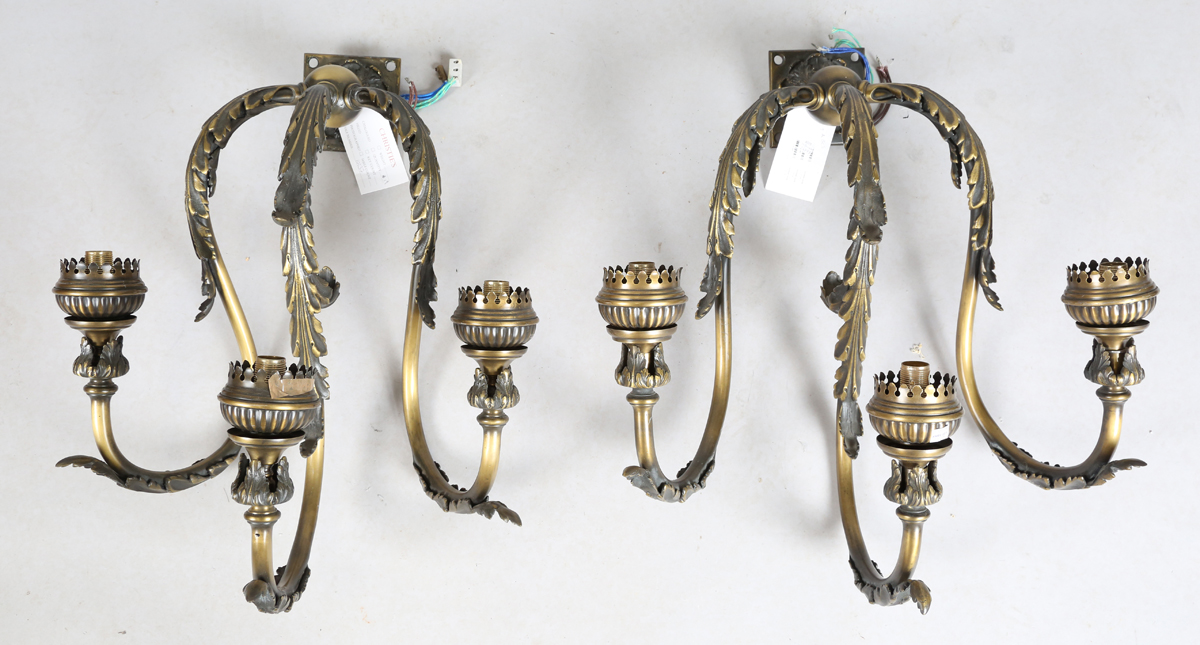 A pair of 20th century gilt brass three-branch wall lights with acanthus leaf mounts and storm lantern style shades, width 68cm.