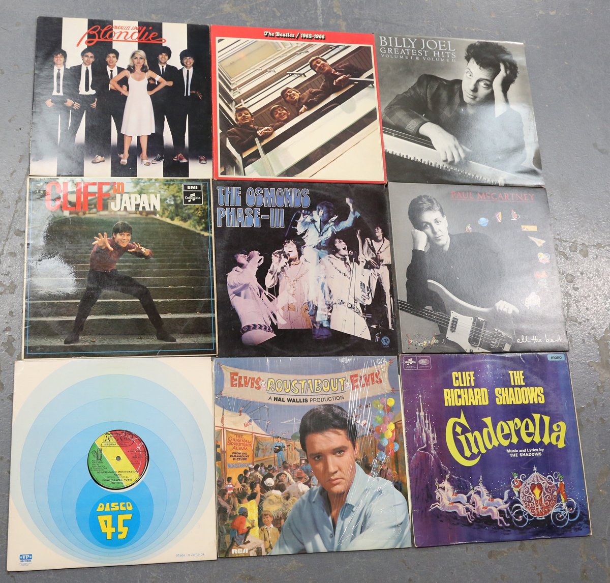 A collection of approximately forty-one LP records, including 'The Beatles 1962-1966', red vinyl pressing, and four twelve-inch singles, including 'Blackman's Foundation' by Hugh Mundell.