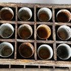 A mid-20th century German pine flowerpot crate, containing galvanized pots, width 50cm, together with four other wooden crates and two metal flowerpot holders.
