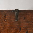 A small 17th century oak boarded six-plank coffer, height 38cm, width 60cm, depth 34cm.