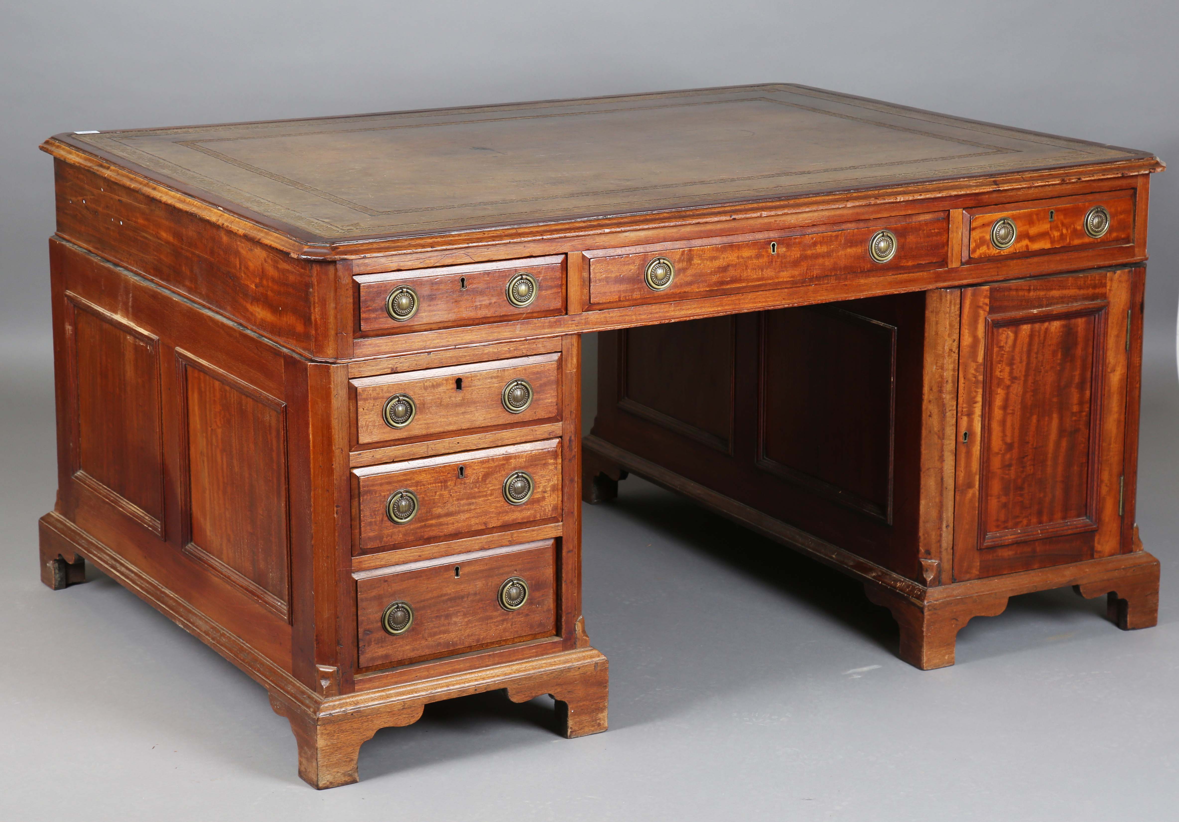 A late Victorian walnut twin-pedestal partners desk, the top inset with gilt-tooled brown leather above an arrangement of drawers and cupboards, height 77cm, width 150cm, depth 114cm.