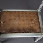 An early 20th century Neoclassical Revival white painted window seat with a carved acanthus and fluted frame, height 65cm, width 65cm, depth 39cm (damage to caned seat).