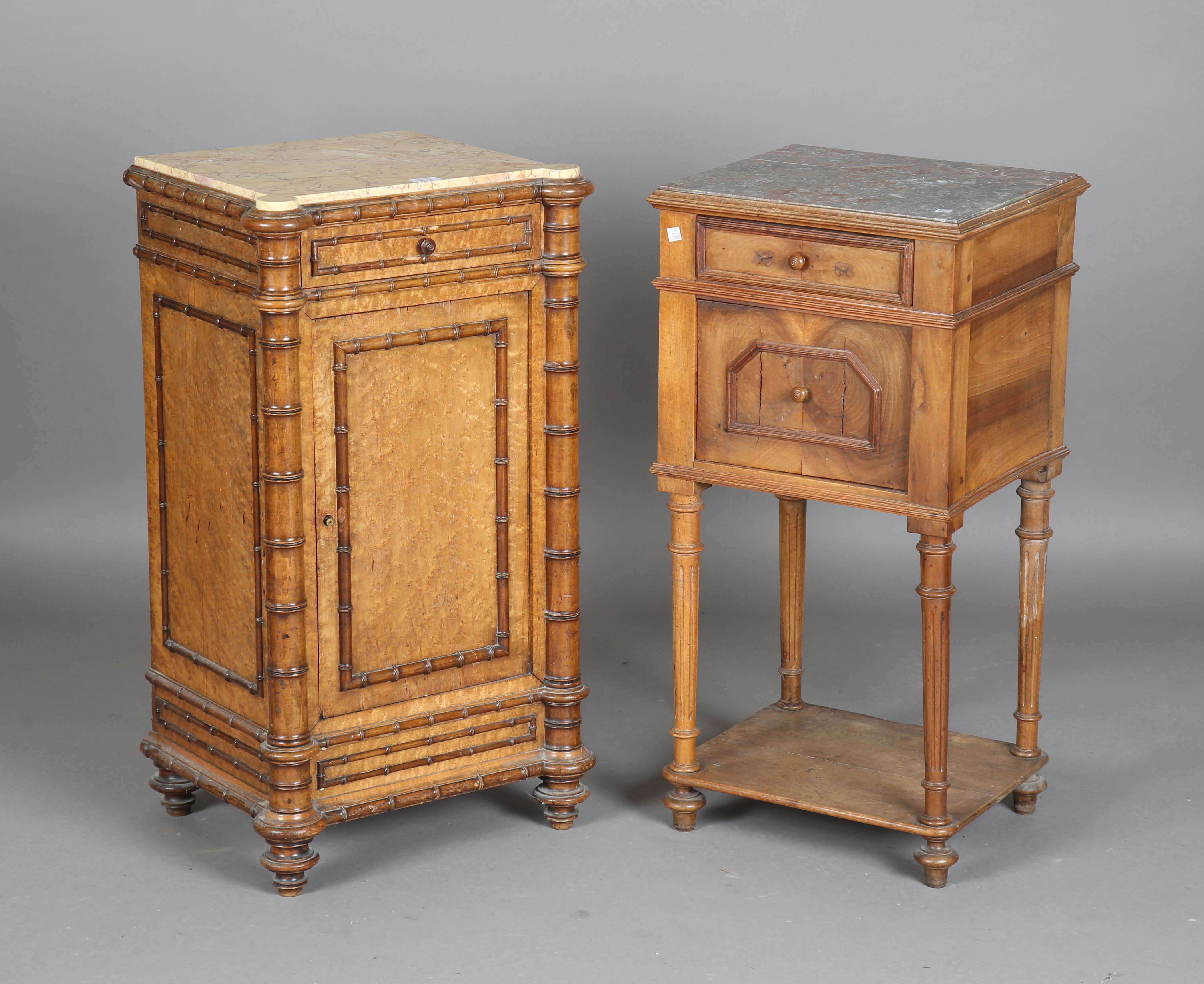 A mid-19th century French faux bamboo and bird's eye maple bedside cabinet with a shaped marble top, height 87cm, width 49cm, depth 40cm, together with another 19th century French walnut bedside cabinet, height 85cm, width 43cm.