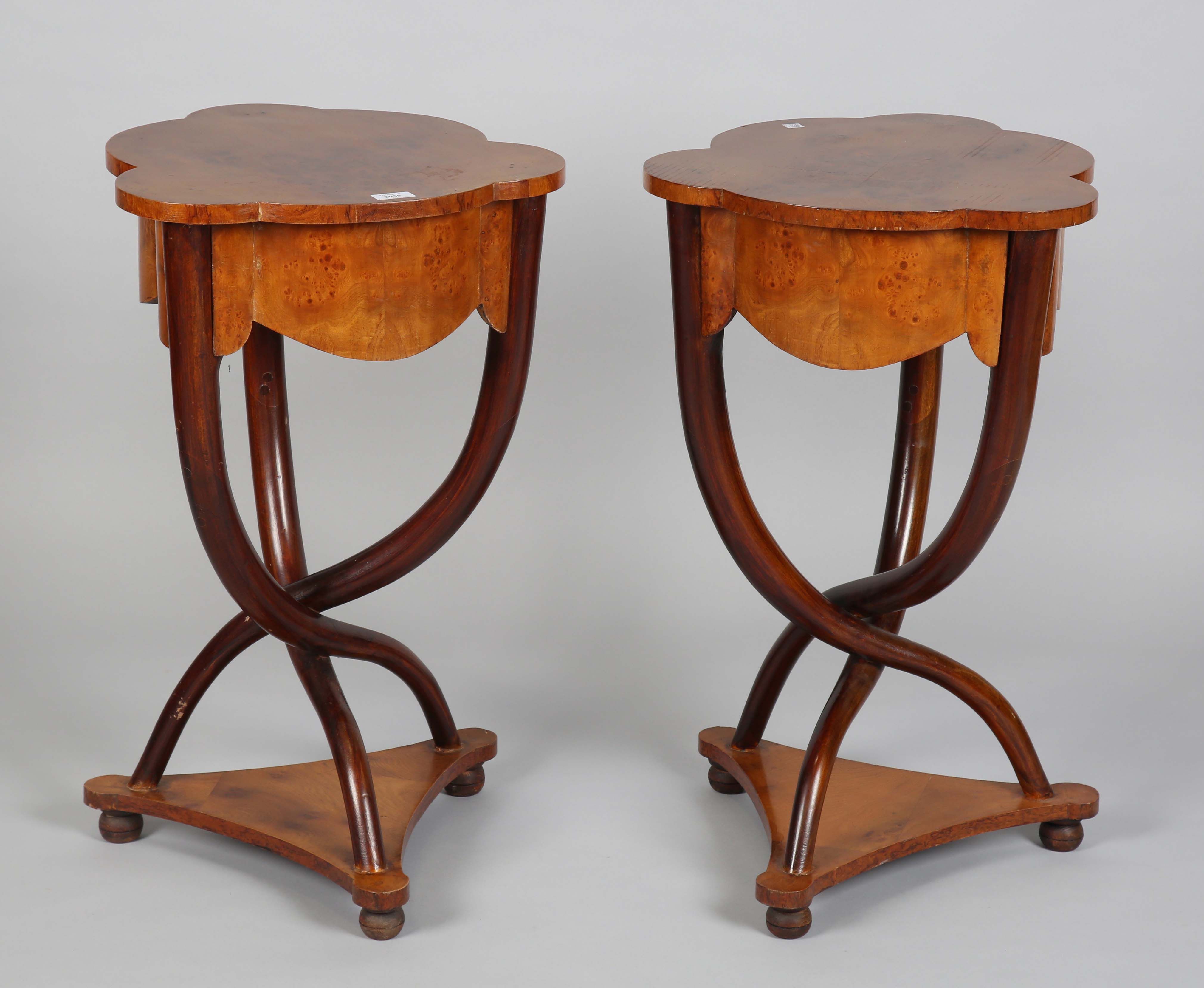 A pair of late 20th century French burr wood and bentwood bedside tables, each fitted with a single drawer, height 74cm, width 45cm, depth 45cm.