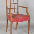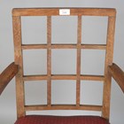 An early 20th century oak framed lattice back elbow chair, attributed to Betty Joel, height 92cm, width 55cm.