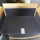 A pair of modern Ercol maple framed two-seat settees, upholstered in blue striped fabric, on angular supports, height 71cm, width 130cm, depth 83cm.