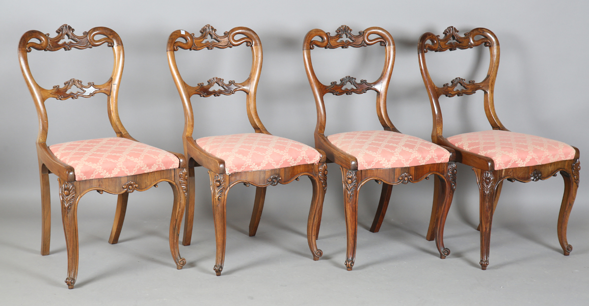 A set of four mid-Victorian rosewood spoon back dining chairs with finely carved foliate decoration, height 90cm, width 47cm, depth 57cm.