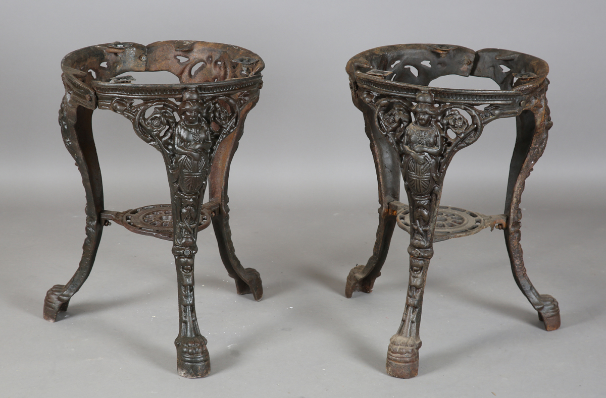 A pair of late Victorian cast iron pub tables with figural Britannia legs united by an undertier, height 65cm, diameter 46cm (lacking tops).