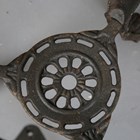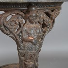 A pair of late Victorian cast iron pub tables with figural Britannia legs united by an undertier, height 65cm, diameter 46cm (one lacking top).