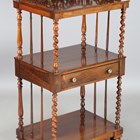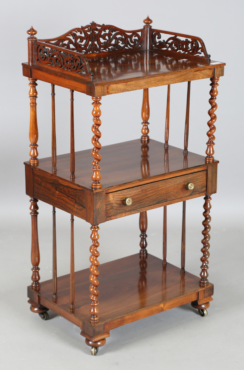 A Victorian rosewood three-tier whatnot with a pierced fretwork gallery and barley twist supports, height 110cm, width 58cm, depth 42cm.