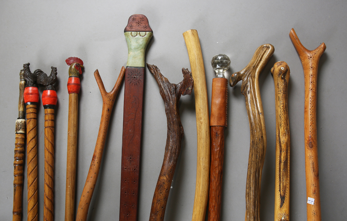 A collection of twenty-four 20th century walking sticks and staffs, mostly with carved stems and handles.